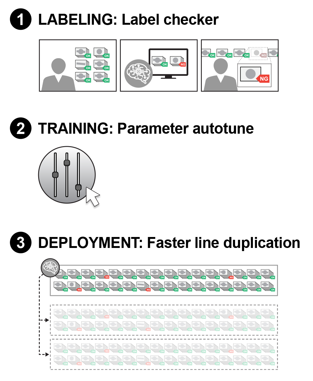 The software offers innovative features like the label checker, streamlining the image labeling process by identifying unmarked or mislabeled defects, significantly reducing manual labeling efforts. Parameter autotune expedites model calibration with a single click, ensuring both speed and accuracy in application setup. Fast line duplication accelerates the validation and deployment of deep learning models across multiple production lines, facilitating scalability and growth.