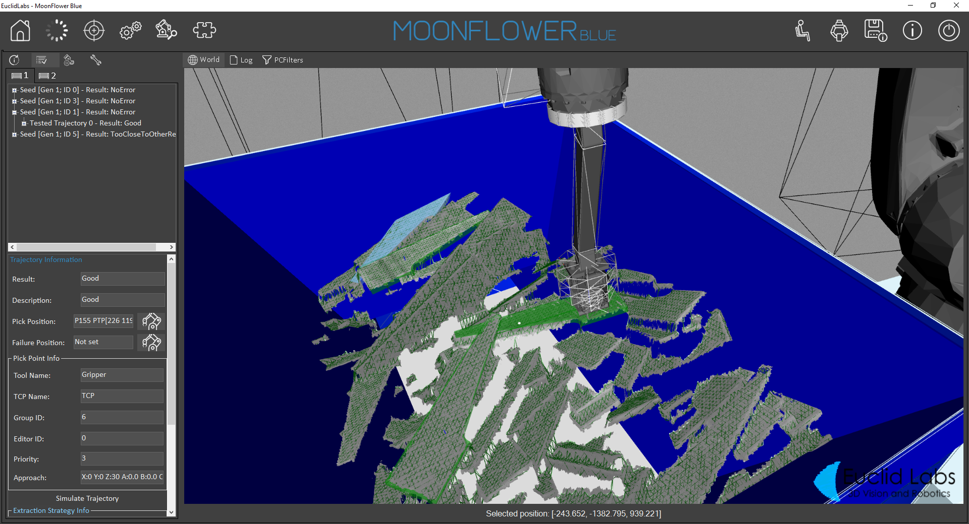 Moonflower Blue generates a picking trajectory starting from the pose of a localized product, checking for collisions between robot and surrounding environment. It can be configured to use multiple grippers and different picking strategies. In addition, when shape and distribution of products inside a bin are very complex, an automatic extraction strategy can be defined for a product model to allow the robot to take out the grasped part in a clean way.
