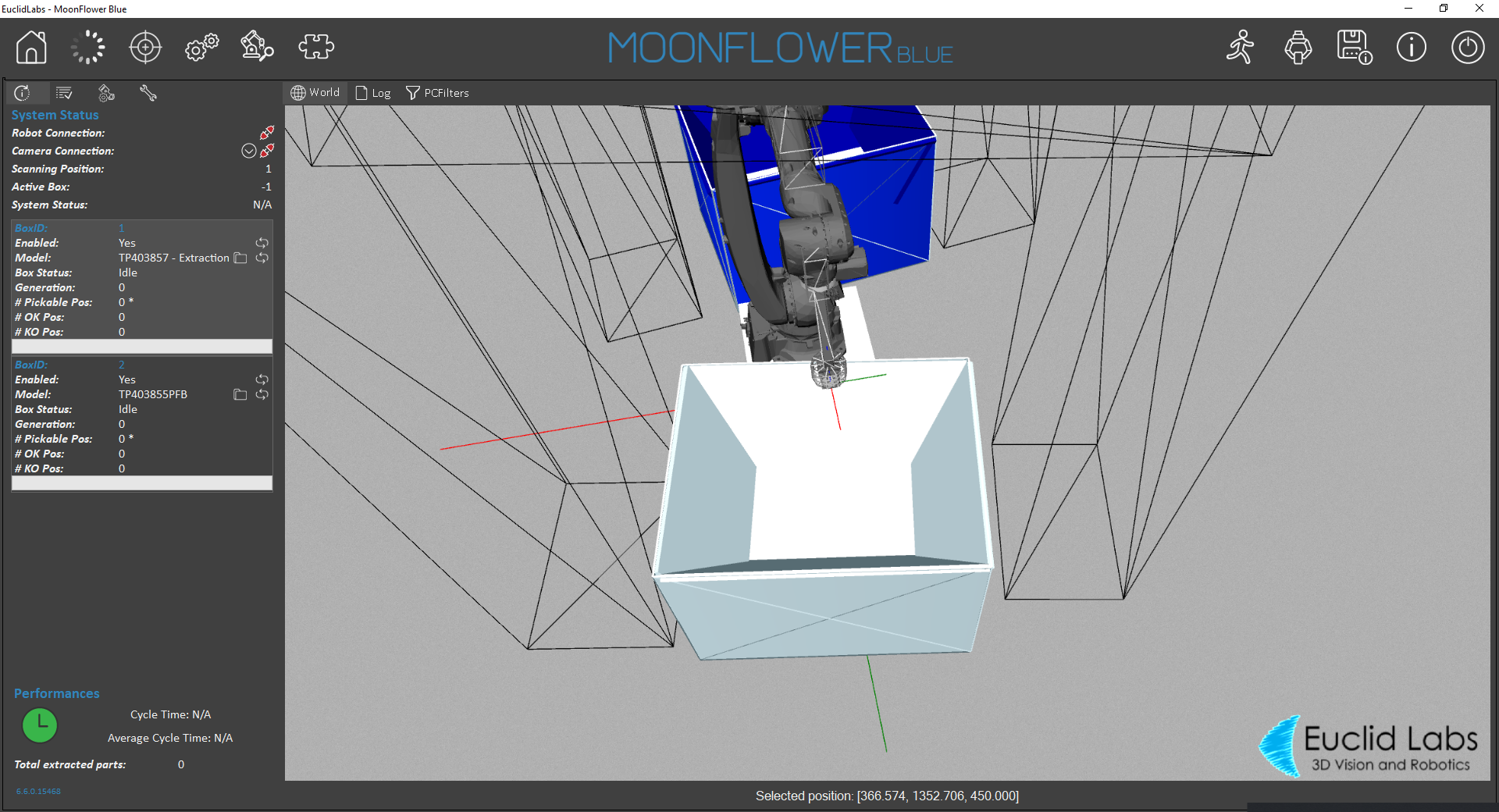 Moonflower Blue is our random bin picking solution. A bin picking process can be explained as follows: a robot (composed of six or more axis) has to pick from a box an object in a stable way to place it properly.