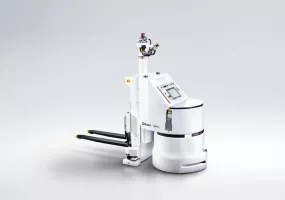 Autonomous forklift AGV for picking up and transporting Euro pallets or pallet cage.