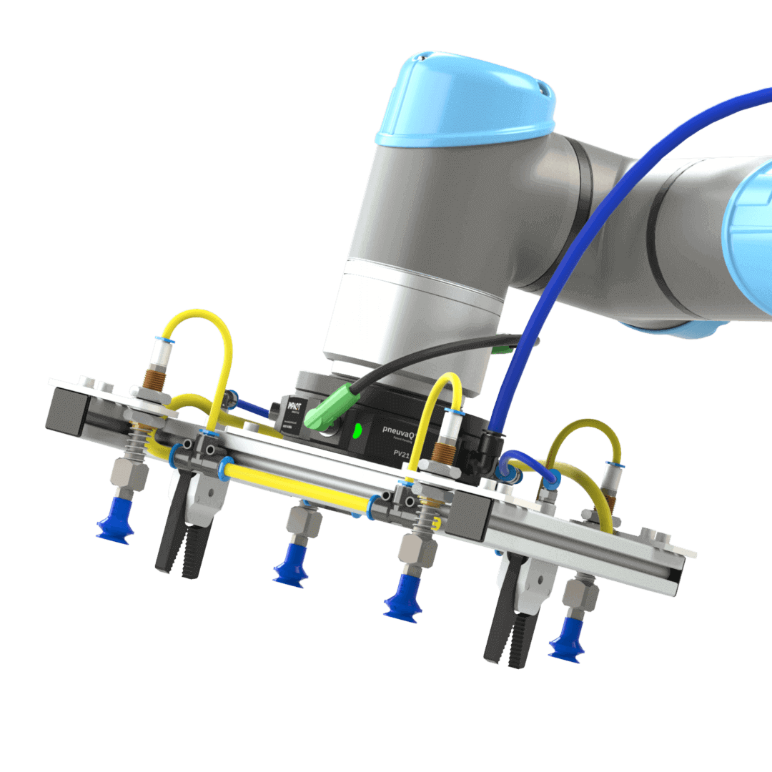 Injection Molding Industry: The pneuvaQ system is exceptionally well-suited for injection molding applications where precision and reliability are key. Its dual capabilities of pneumatic and vacuum controls make it ideal for machine tending tasks, such as using a finger gripper to hold and remove runners and a suction cup gripper to handle the actual workpieces. This dual functionality ensures seamless transitions in handling various components, enhancing both productivity and operational efficiency.