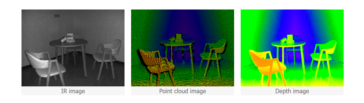 IR and depth output simultaneouslyVzense ToF products can output 12 bit depth images and black-and-white images at the same time. The two images are completely aligned in time and space.