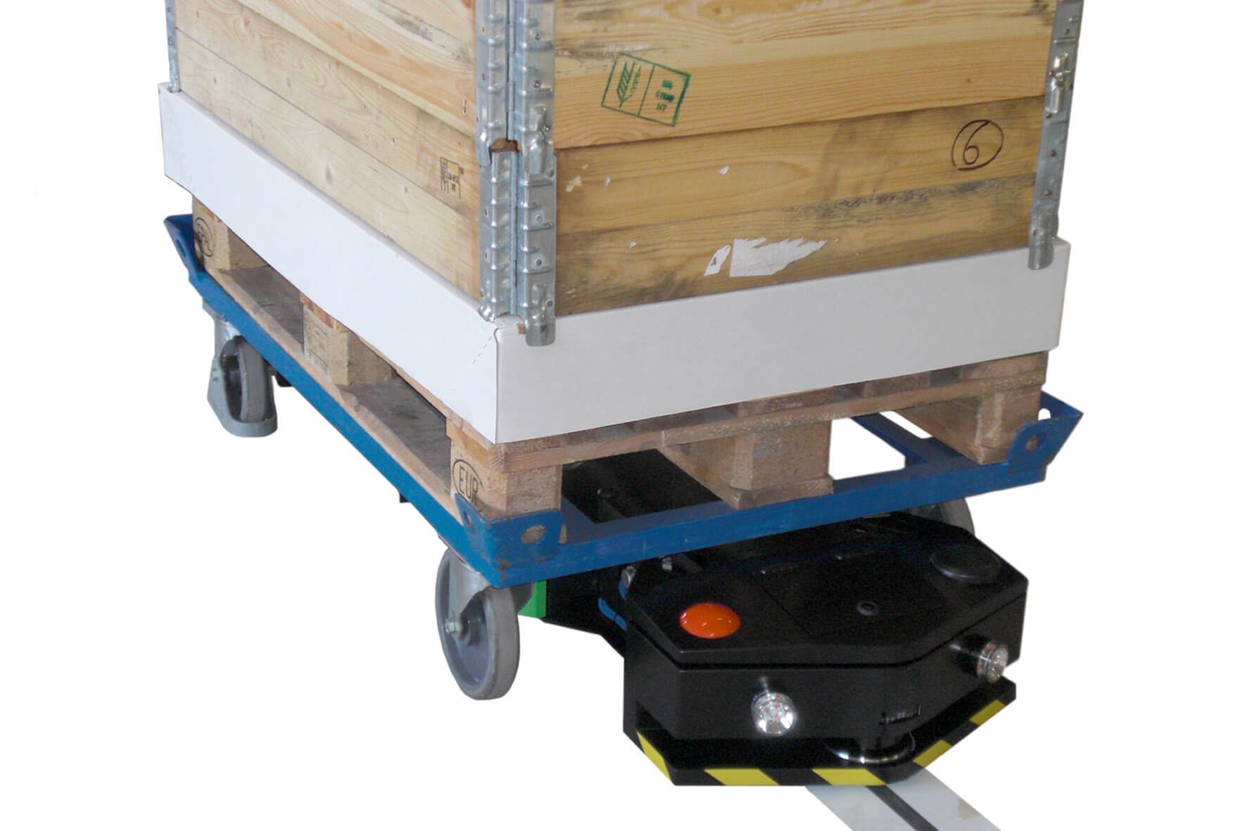 The AGV1000-UnderRider is a high-end automatically guided vehicle, specially designed for the bi-directional moving pallet undercarriages. The design has been optimized, so no adjustments are required to couple these pallet undercarriages with four castors. The electric tug is capable of following an optic route completely autonomously, and can be simply operated with a full color control panel. The AGV1000-UnderRider is mostly used for material handling in a production environment, where goods are already on existing pallet undercarriages. It is equipped with the function to read RFID-tags and is able to drive variable speeds up to 3.4 km/h.