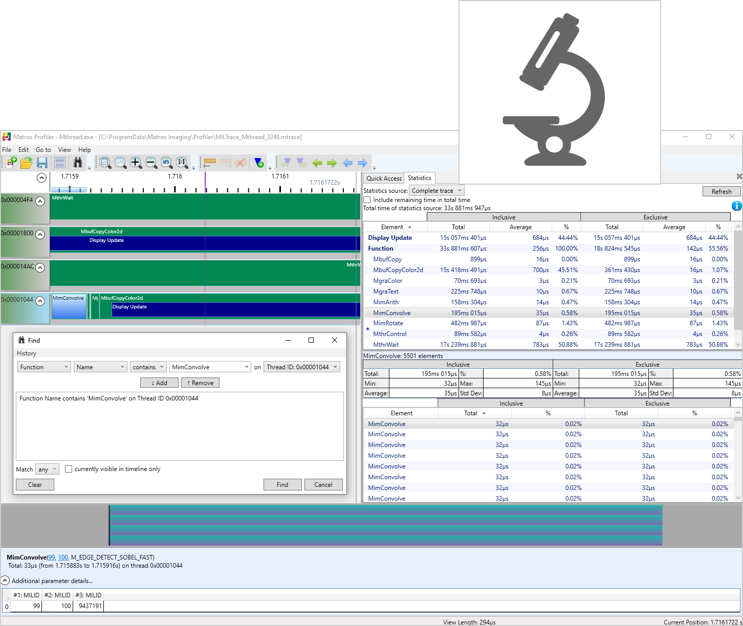 Matrox Profiler is a Windows-based utility to post-analyze the execution of a multi-threaded application for performance bottlenecks and synchronization issues. It presents the function calls made over time per application thread on a navigable timeline. Matrox Profiler allows the searching for, and selecting of, specific function calls to see their parameters and execution times. It computes statistics on execution times and presents these on a per function basis. Matrox Profiler tracks not only MIL X functions but also suitably tagged user functions. Function tracing can be disabled altogether to safeguard the inner working of a deployed application.