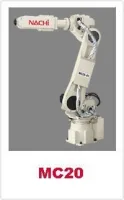 The Nachi MC12S is a high speed and compact version of the MC20 excellent for use in work cells with limited space. The MC12S robot achieves even higher speeds than its larger counterparts in the MC series due to its reduced size. A slim base minimizes required floor space and provides floor, wall, and ceiling mounting options to further extend application possibilites and reduce work cell size. The MC12S model offers a reach of 1400mm and provides point repeatability of ± 0.06mm. Compact arm design reduces interference with peripheral equipment and is also IP65 compliant. Internal air supply lines and signal cabling support numerous applications, optional internal pneumatic valves eliminate the need for shoulder-mounted valve packages.