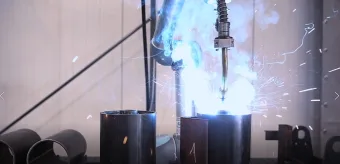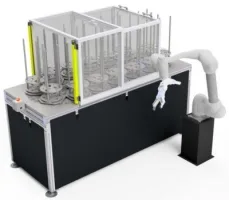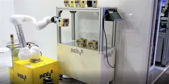 The cobot is equipped with motion sensors so people can work safely in its vicinity (changing pallets, for example, is not a problem)