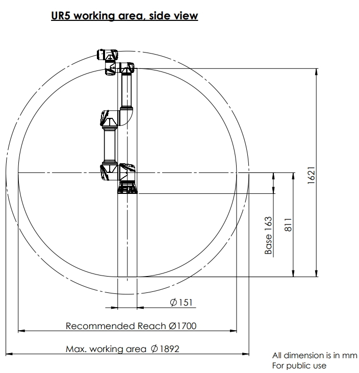 The medium-sized member of the Universal Robots family is ideal for automating low weight processing tasks with its 5 kg payload and 850 mm reach radius. Easy to program and fast to set up, the UR5 strikes the perfect balance between size and power.